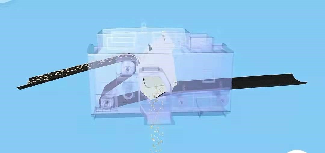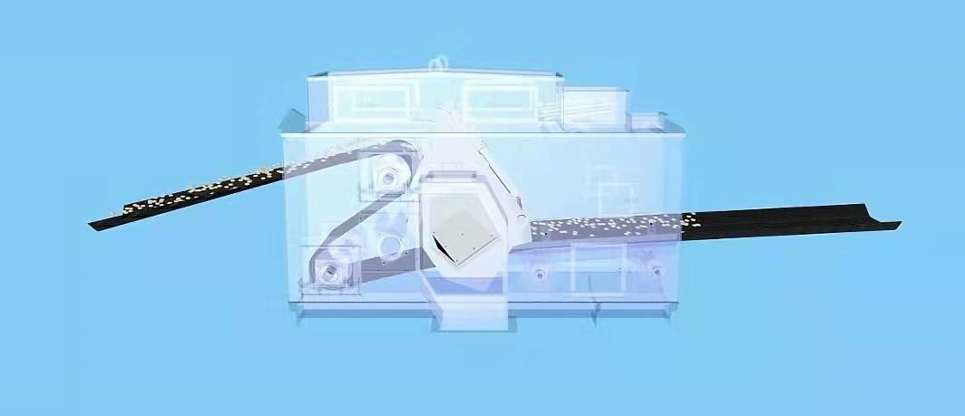 当三通漏斗出口与两侧卸料口错开时,翻转到另一个极限位置时,物料抛下来之后,落在输送带上继续向前输送,此时为不进行中间卸料状态。如图6、7所示: