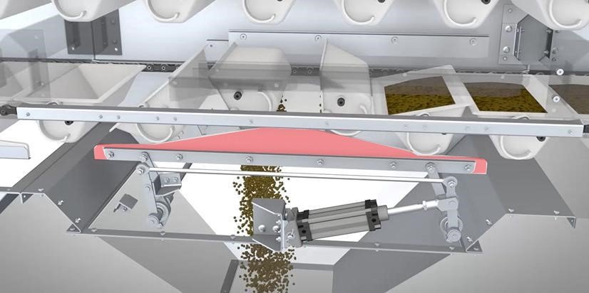 Z型提升机属于转斗式提升机,在封闭的壳体内,通过悬挂在链条上的料斗输送物料,能够水平+垂直+水平组合输送,可以实现多点卸料。多点卸料是通过在出料口上方配置气动翻斗机构,卸料时,控制气缸触发“凸弧挡块”触碰畚斗侧面“圆环挡块”,使畚斗被迫翻转卸料,如图11、12所示。