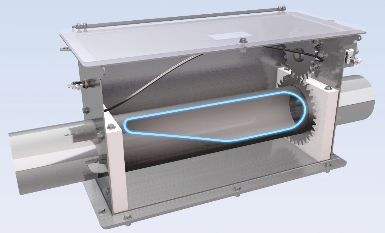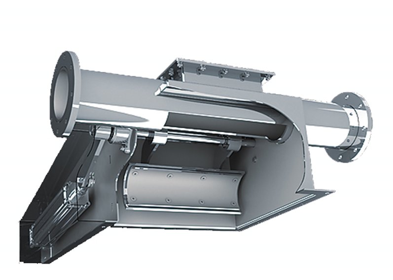 2、 气动开合卸料阀,应用在对物料破损率低和卸料无残留的工况,特别是食药行业应用较多,可以实现卸料彻底无残留,见图14所示。它的工作原理是通过气缸执行臂摆动,对输送管道下面“剖口面”实现“开口卸料”和“闭合关闭”的功能,它的优点是卸料反馈快速彻底,缺点是不能实现部分卸料,只能完全卸料。